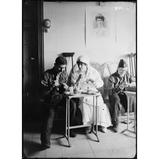 Hôpital Complémentaire du Val-de-Grâce n°11. 57 Boulevard de Montmorency. Paris (dénommé aussi Ambulance Italienne). Mademoiselle X. avec des blessés faisant de la peinture.