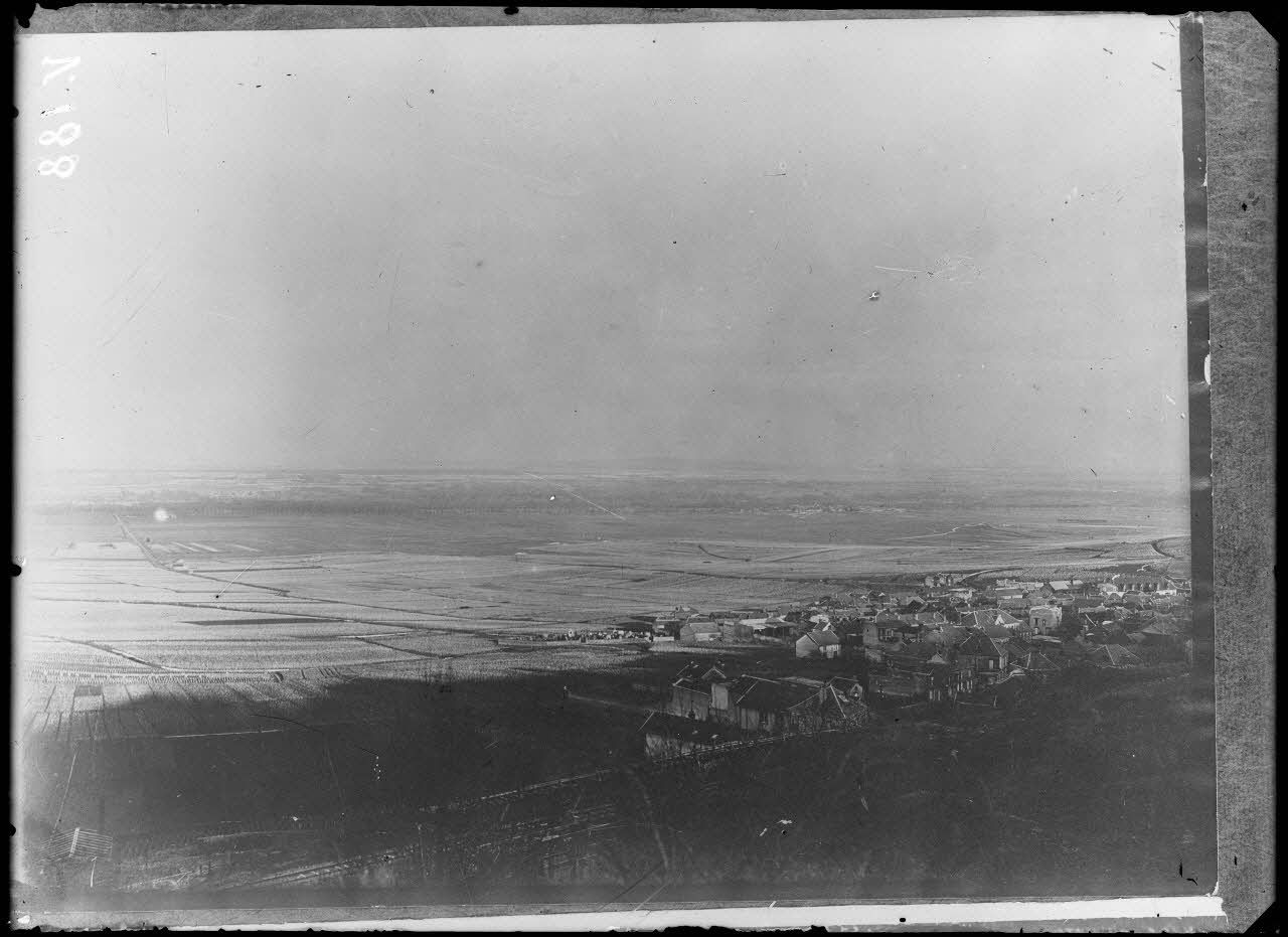 Verzenay, Marne, panorama des lignes allemandes prise de la falaise de Champagne se trouvant derrière quatre moulins.