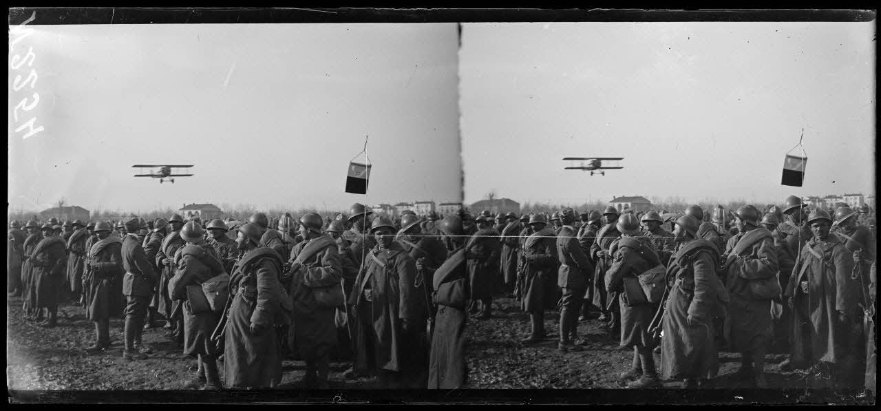 Vicence (Italie). Revue des troupes italiennes par le général Maistre et le général Pecori Giraldi. Un avion français survole les troupes (3-2-18).
