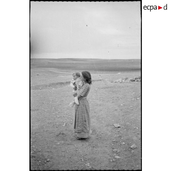 Vie quotidienne au 8e RIM. Une jeune femme tient un enfant dans ses bras.