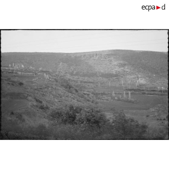 Vie quotidienne au 8e RIM. Vues de la campagne environnante située à proximité du convoi de véhicules militaires arrêtés.