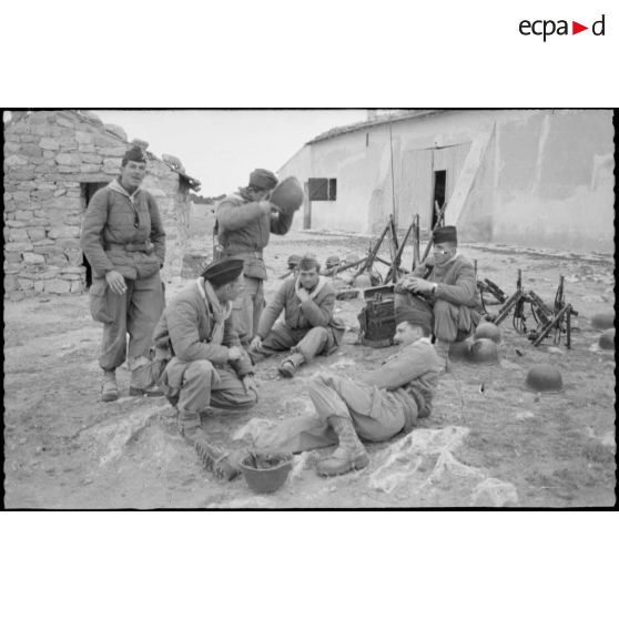 Vie quotidienne au 8e RIM. Portrait d'un groupe de soldats assis. Repos pendant une manoeuvre, les armes sont disposées en faisceau. En arrière plan, une bâtisse.