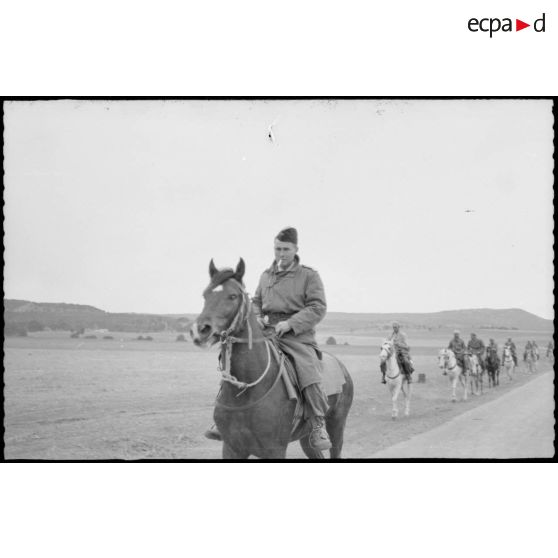 Vie quotidienne au 8e RIM. Des spahis à cheval le long d'une route.