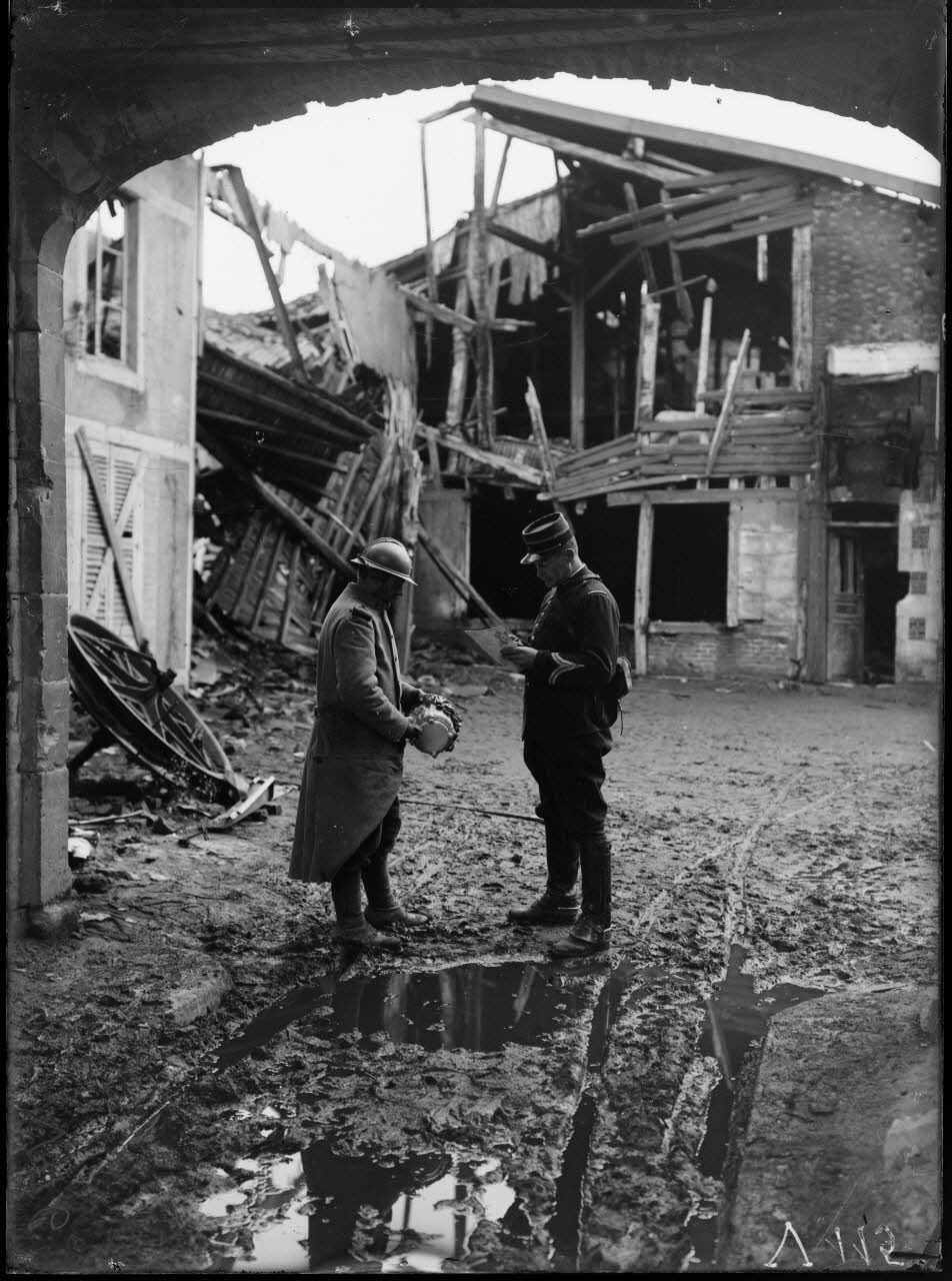 - Á Vienne-le-Château (Marne, 03/12/1915, V 115, V 128 et V 131) le village en partie détruit est occupé par les troupes françaises. Un soldat est contrôlé par un gendarme.
