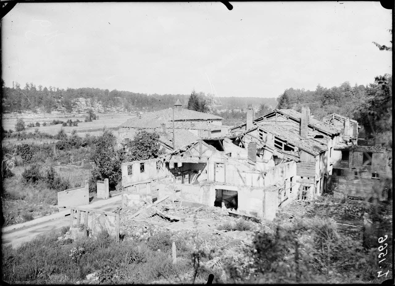 - à Vienne-le-Château : la tombe d'une femme fusillée par les troupes françaises (madame Méricoy ? SPA 27 L 1516), l'église et l'usine en ruines (SPA 27 L 1564), l'intérieur de l'usine en ruines (les ateliers détruits SPA 27 L 1569), la rue conduisant à La Harazée, la rue principale du village, la villa où était installé le commandement allemand ;