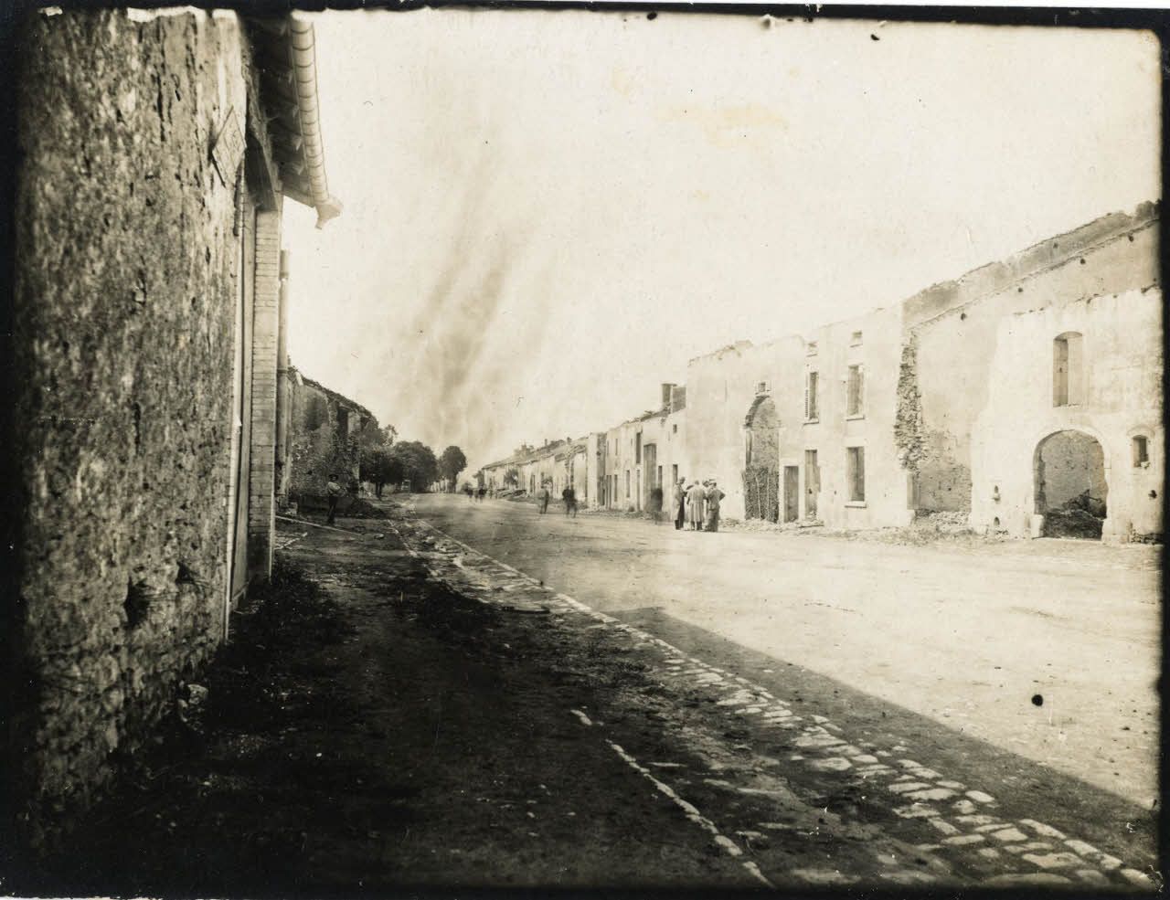 D169-1-6. [Lironville. Trois soldats dans une rue en ruine].