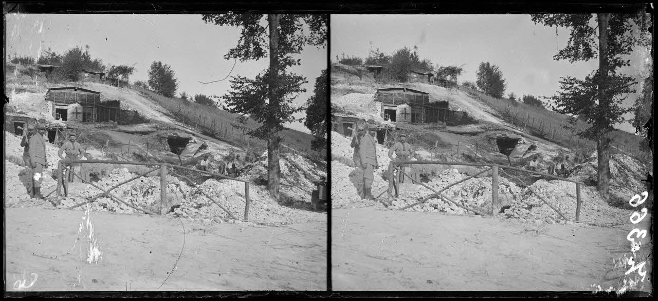 Dans la carrière du Chauffour (sur la commune de Thiescourt, Oise, Z 397 à Z 408), les soldats organisent leur cantonnement dans la carrière (cuisine, chambrée, tailleur et cordonnier, poste de secours, cimetière).
