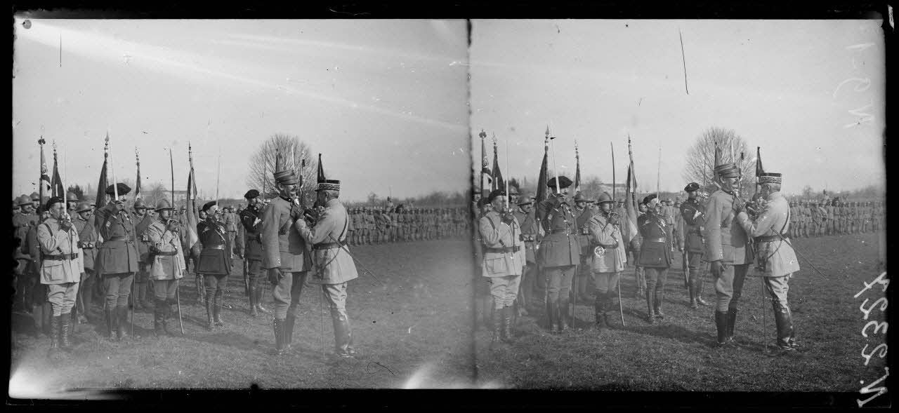 Villaverla (Italie). Revue de la 47e Division d'infanterie française et de la brigade italienne Sassari passée par le roi d'Italie et le général Maistre (10-3-18). Le général Maistre décore le colonel commandant la mission italienne près l'armée française d'Italie. [légende d'origine]