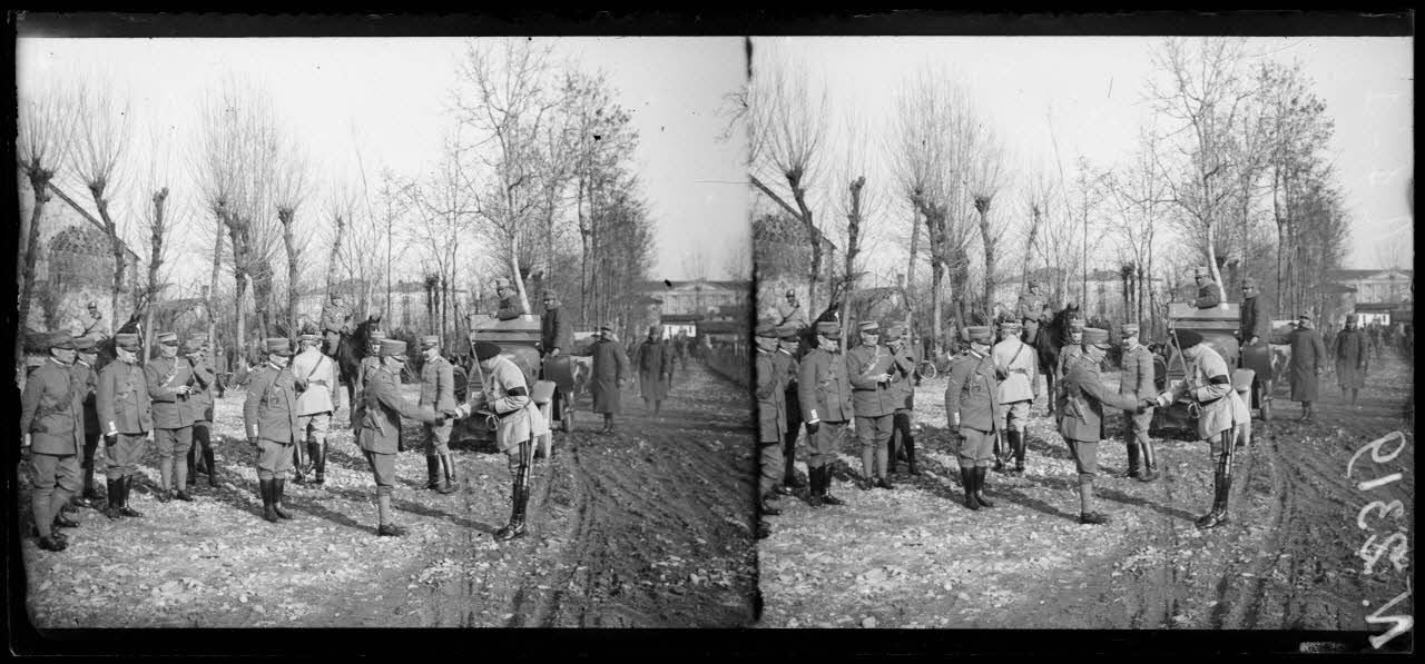 Villaverla (Italie). Revue de la 47e Division d'infanterie française et de la brigade italienne Sassari passée par le roi d'Italie et le général Maistre. Le général Maistre prend congé des officiers italiens.