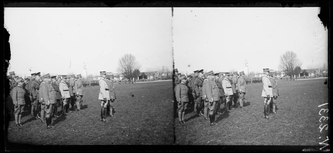 Villaverla (Italie). Revue de la 47e Division d'infanterie française et de la brigade italienne Sassari passée par le roi d'Italie et le général Maistre (10-3-18). Le Roi, le général Maistre et les officiers supérieurs pendant le défilé. [légende d'origine]