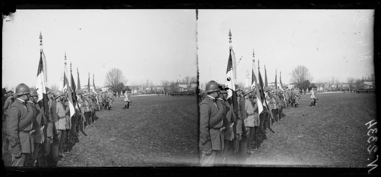 Villaverla (Italie). Revue de la 47e Division d'infanterie française et de la brigade italienne Sassari passée par le roi d'Italie et le général Maistre (10-3-18). Les drapeaux italiens pendant le défilé, au fond le Roi et le général Maistre. [légende d'origine]