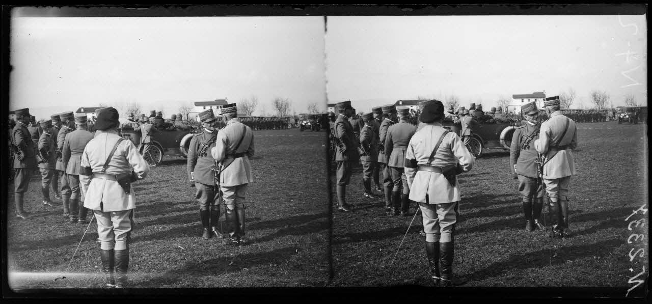 Villaverla (Italie). Revue de la 47e Division d'infanterie française et de la brigade italienne Sassari passée par le roi d'Italie et le général Maistre. Le général Maistre prend congé des officiers italiens. [légende d'origine]