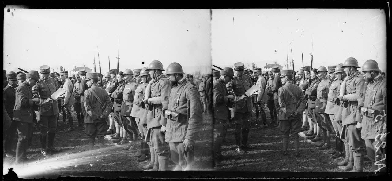 Villaverla (Italie). Revue de la 47e Division d'infanterie française et de la brigade italienne Sassari passée par le roi d'Italie et le général Maistre. Le Roi remet des décorations à des soldats français (10-3-18).