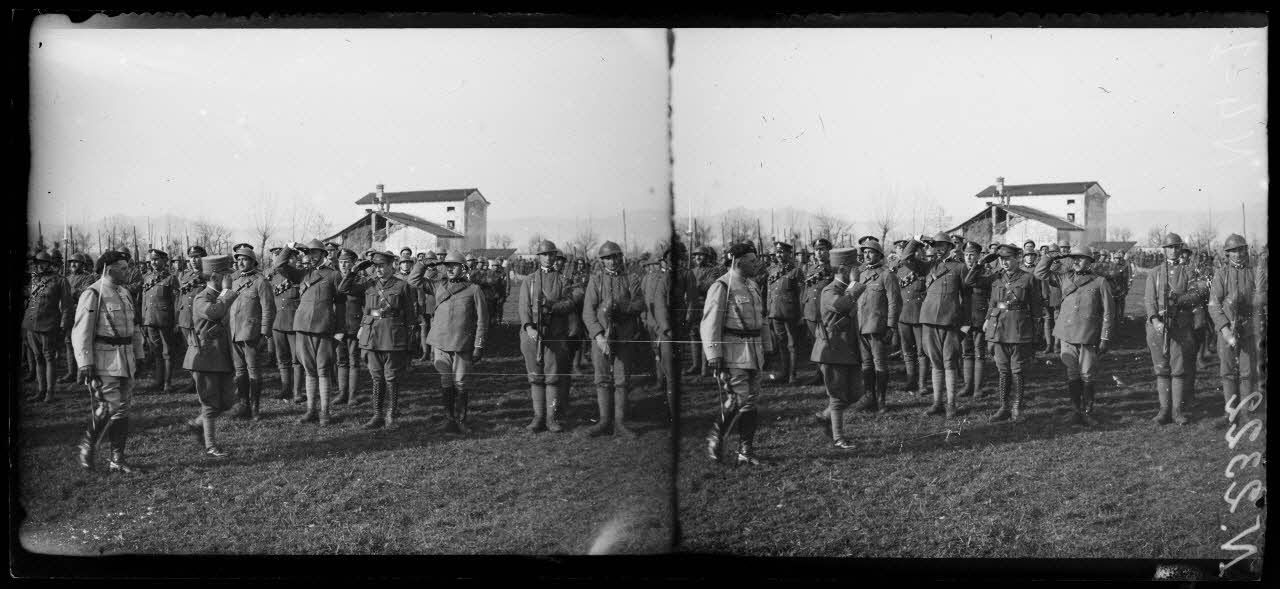 Villaverla (Italie). Revue de la 47e Division d'infanterie française et de la brigade italienne Sassari passée par le roi d'Italie et le général Maistre. Le général Maistre décore des soldats italiens.