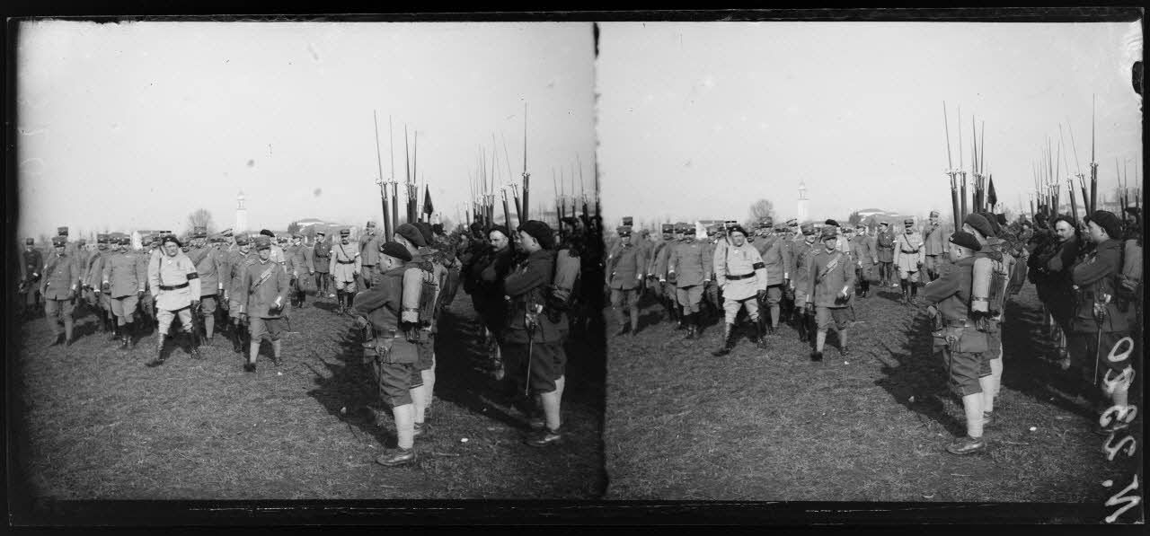 Villaverla (Italie). Revue de la 47e Division d'infanterie française et de la brigade italienne Sassari passée par le roi d'Italie et le général Maistre. Les chasseurs alpins après la revue.