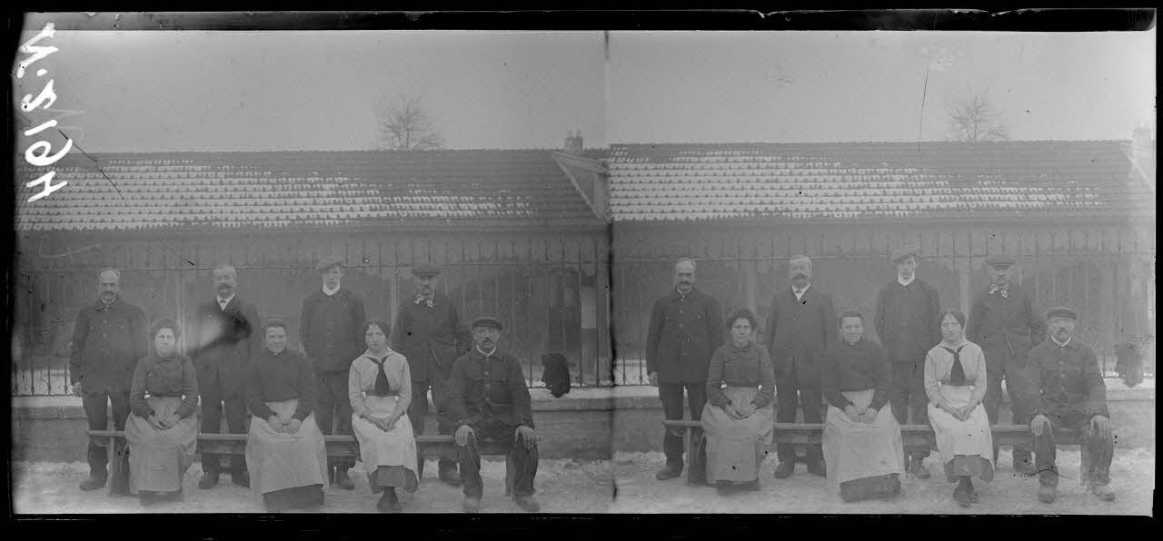 Jonchery-sur-Vesle (Marne). Groupe de secrétaires d'état major de la 20e section devant leur réfectoire (janvier 1918).