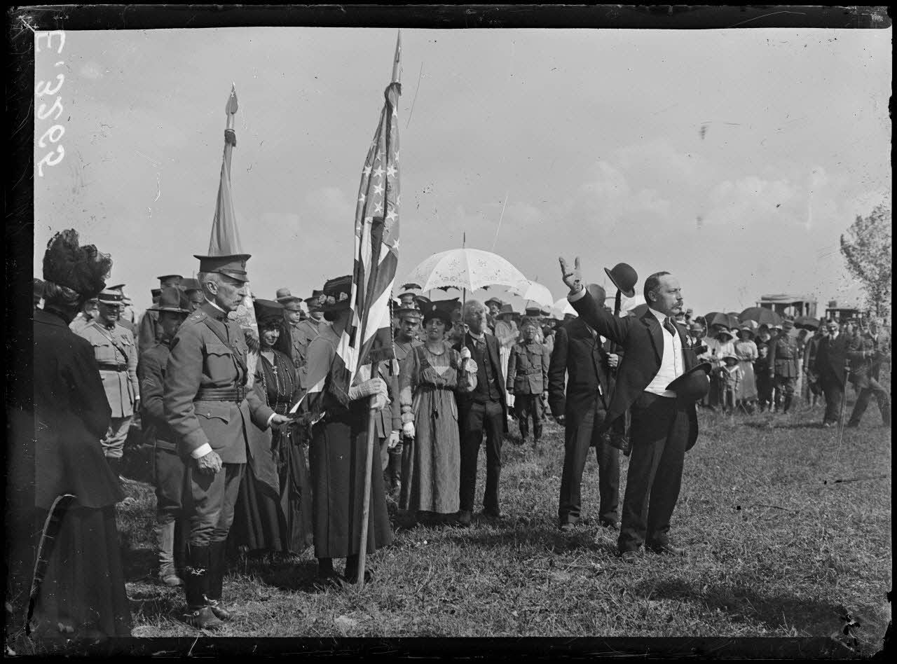 Ville sur Terre. Aube. Remise au 11e régiment américain de deux drapeaux offerts par les descendants du Maréchal de Rochambeau. Le discours du Marquis de Dompierre. [légende d'origine]