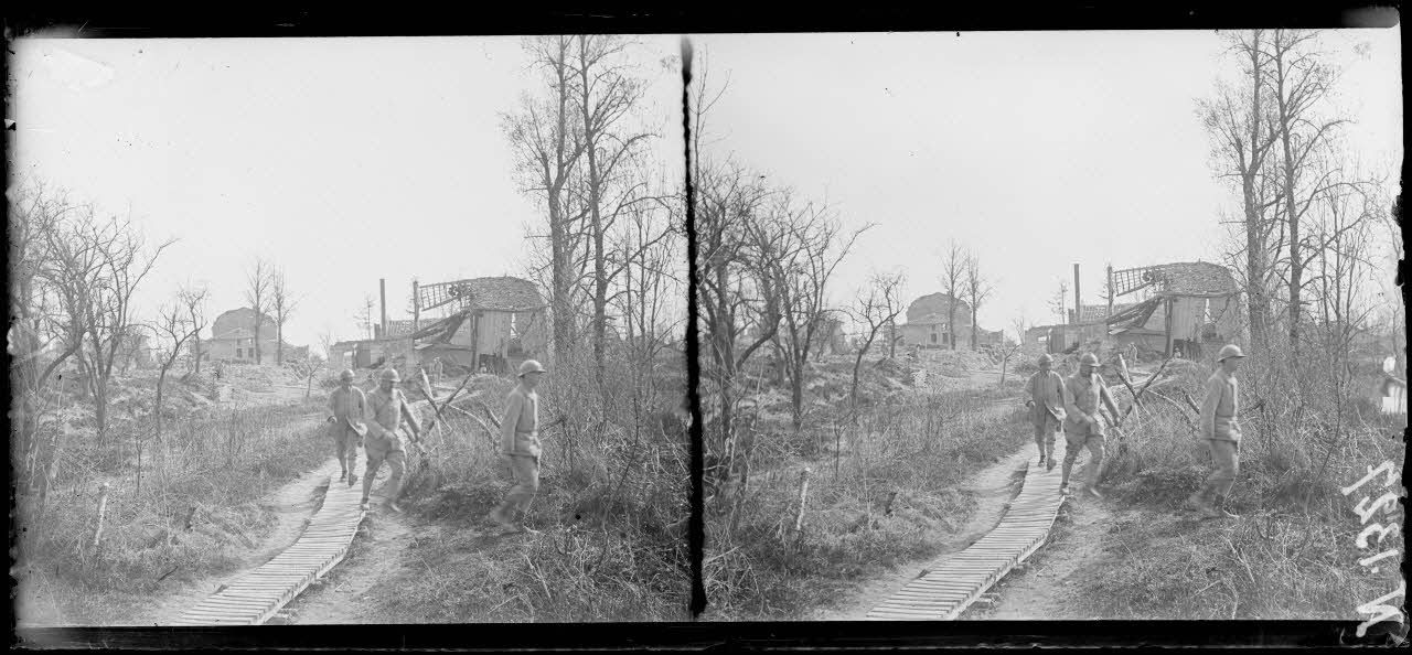 - A Ville-sur-Tourbe, presque totalement ruiné par les bombardements, une barricade protège l'entrée de la ville. La cloche de l'église est transformée en avertisseur contre les gaz. Les soldats prennent leur repas au milieu des décombres et circulent en sous-bois le long de la rivière sur un chemin hors d’eau aménagé avec des caillebotis. Le PC d’un colonel est aménagé au pied d’une maison en ruines. Un mulet sort d'un abri souterrain. Non loin de là, à Virginy, une route est camouflée par des filets.