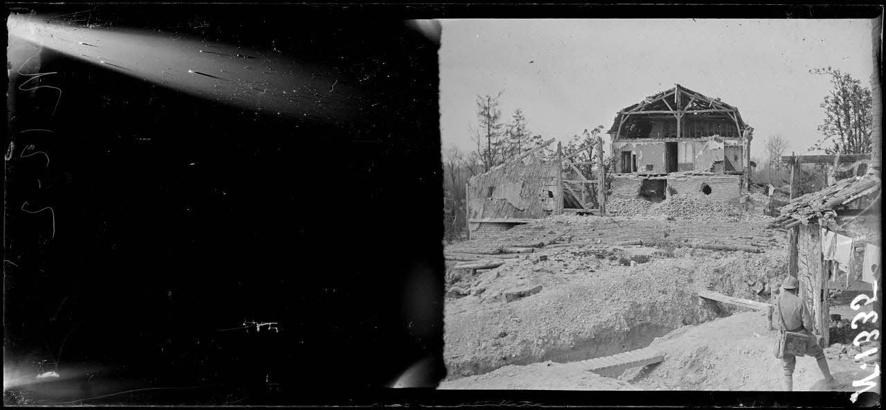 - A Ville-sur-Tourbe, presque totalement ruiné par les bombardements, une barricade protège l'entrée de la ville. La cloche de l'église est transformée en avertisseur contre les gaz. Les soldats prennent leur repas au milieu des décombres et circulent en sous-bois le long de la rivière sur un chemin hors d’eau aménagé avec des caillebotis. Le PC d’un colonel est aménagé au pied d’une maison en ruines. Un mulet sort d'un abri souterrain. Non loin de là, à Virginy, une route est camouflée par des filets.
