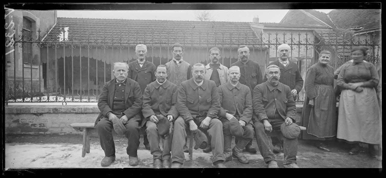 - A Villedommange (Marne, 12/01/1918, V 2318 à V 2323), plusieurs groupes d'habitants du village sont réunis pour établir des photographies d'identité.