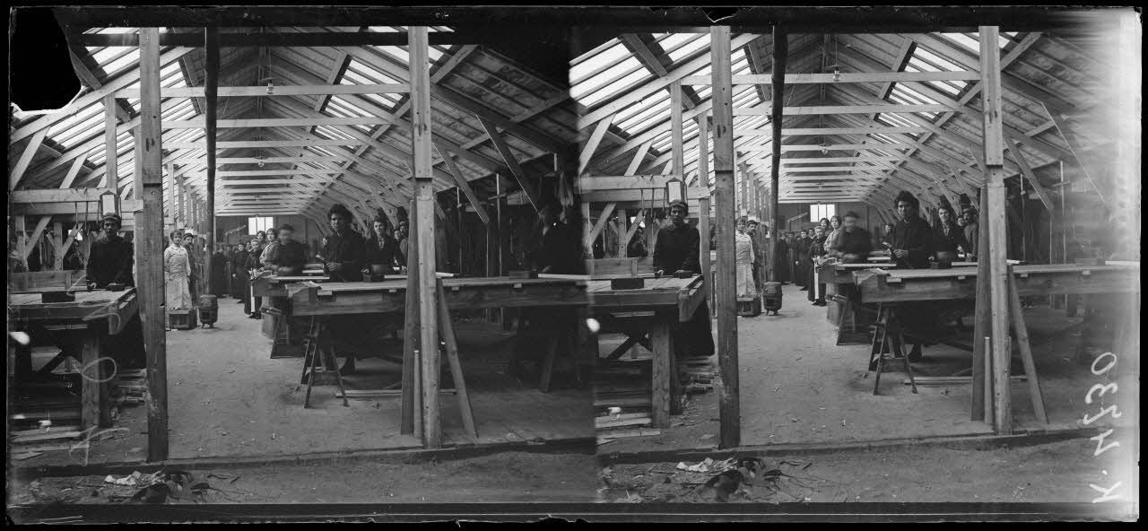 A Vincennes (01/12/1916, de K 4715bis à K4736), des ouvriers construisent des éléments de baraquements Adrian. Les éléments de l'intendance confectionnent des panneaux de bois et les conditionnent avant leur expédition vers le front.