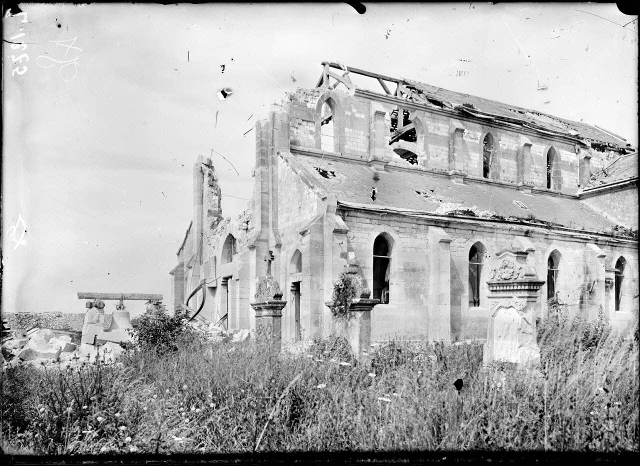 - à La Harazée, les ruines de l'église, le clocher effondré, la villa incendiée par les Allemands avant leur départ,