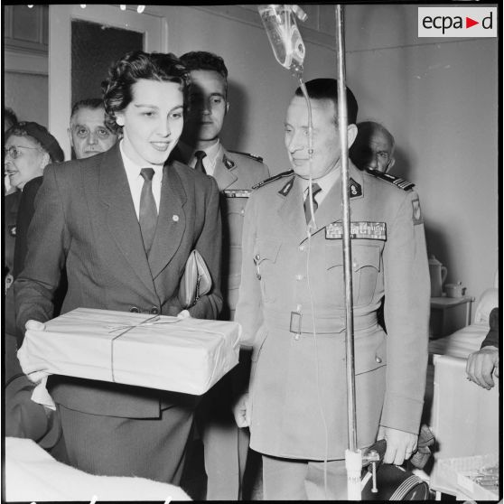 A l'occasion du 94e anniversaire de Camerone, le colonel Marguet participe à une distribution de colis aux patients de l'hôpital Maillot. A es côtés une assistante sociale de la Croix rouge française.
