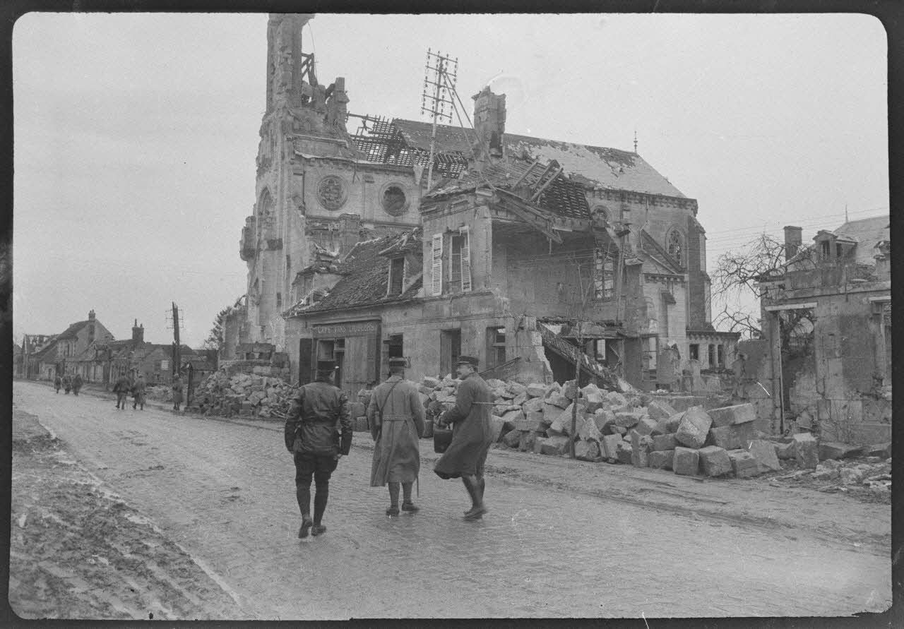 Passage de responsables militaires dans la rue principale d'un village dont les habitations, les commerces mais aussi l'église ont subi les effets de la guerre.
