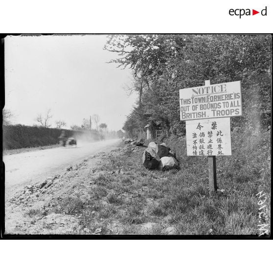 - l'image d'un panneau indiquant l'interdiction aux soldats britanniques et aux travailleurs chinois de pénétrer dans le secteur français ;