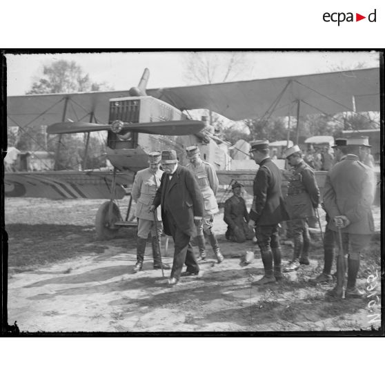 - La visite du terrain d'aviation de Fouilloy par Georges Clemenceau. Le Président du Conseil et ministre de la guerre examine un bombardier Bréguet XIV.