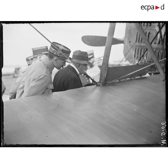 Fouilloy, visite de Monsieur Clemenceau au camp d'aviation. Monsieur Clemenceau examine un appareil.;
