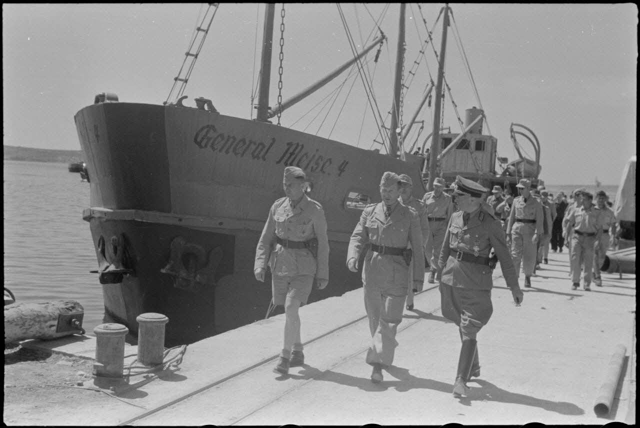Visite du chantier naval de Perama (Athènes) en présence du colonel Götsche et d'un officier de la Luftwaffe titulaire de la croix de chevalier de la croix de fer (Ritterkreuz).