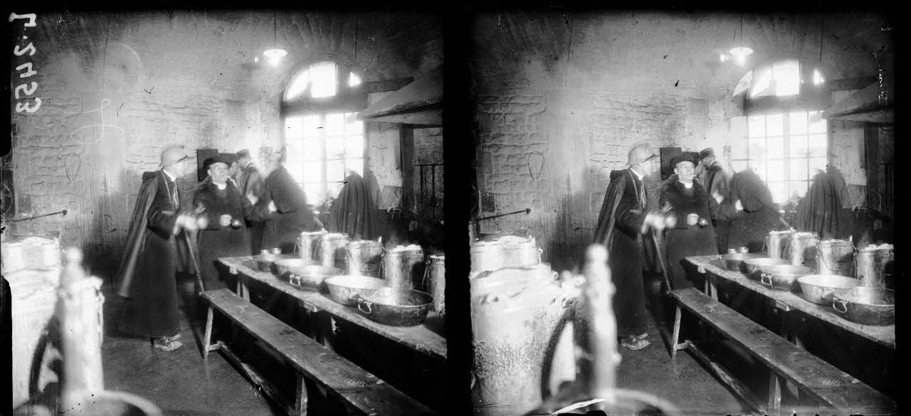 Visite du front de Verdun par la mission des évêques français et espagnols. Une cuisine régimentaire, fort du Rozellier. [légende d'origine]