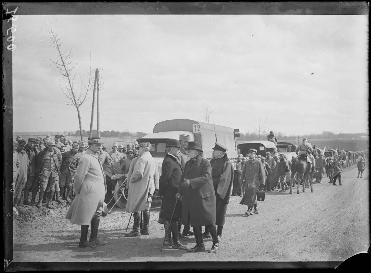 Visite du président de la République à la 5e armée. Le président, Antonin Dubost, M. Deschanel et le général Nivelle. [légende d'origine]