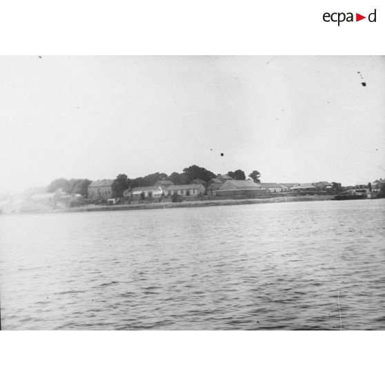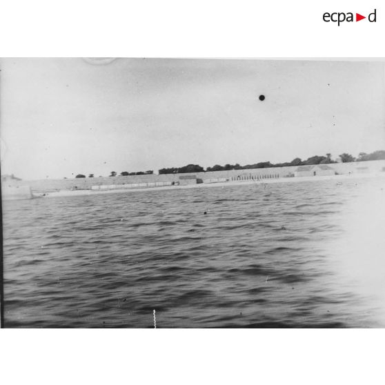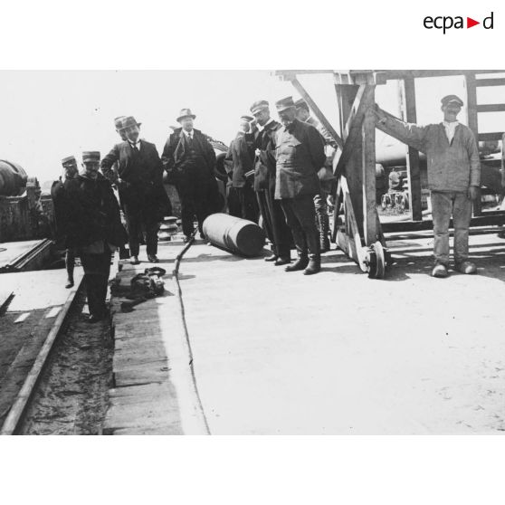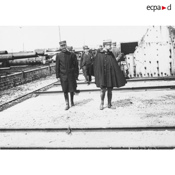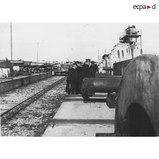 Vue plongeante sur le dispositif de défense constitué de canons le long desquels déambulent une délégation d'officiels.