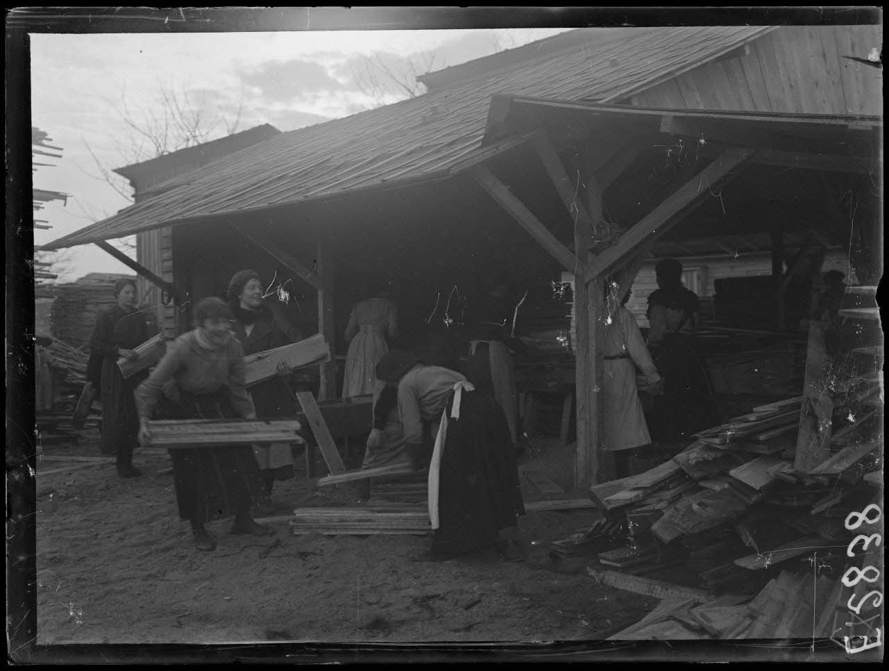 Vitry le François. Marne. Les femmes transportent sur des wagonnets le bois débité.