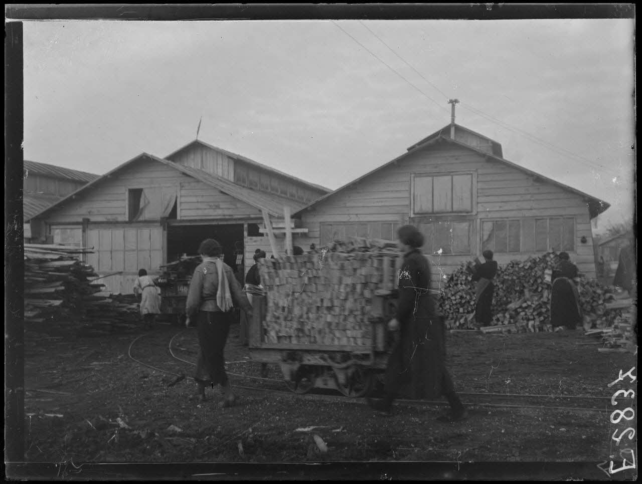 Vitry le François. Marne. Les femmes transportent sur des wagonnets le bois débité.