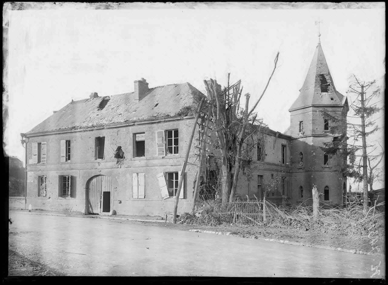- A Challerange (au sud de Vouziers), un réseau de fils de fer barbelés recouvre le parvis de l'église en ruines. La gare est détruite.
