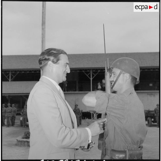 Max Lejeune remet la médaille du mérite militaire du régiment à un soldat d'une unité du 2e Groupe du 19e RA.