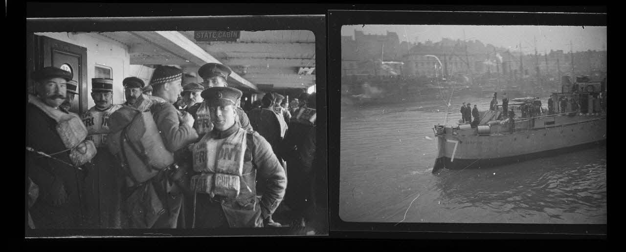 Reportages de plaques positives aux sujets divers, traitant de la visite à Compiègne pour observer les débris du zeppelin abattu le 17 mars 1917, des visites dans les régions dévastées ou encore le voyage d'une délégation française sur un navire britannique, probablement à destination de l'Angleterre.
