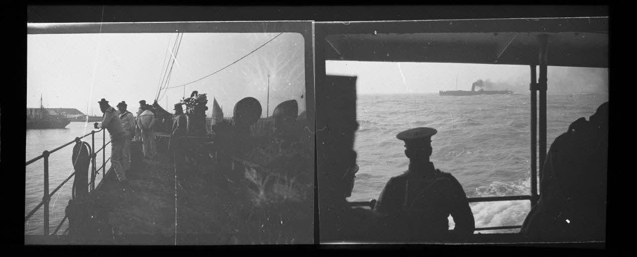Reportages de plaques positives aux sujets divers, traitant de la visite à Compiègne pour observer les débris du zeppelin abattu le 17 mars 1917, des visites dans les régions dévastées ou encore le voyage d'une délégation française sur un navire britannique, probablement à destination de l'Angleterre.