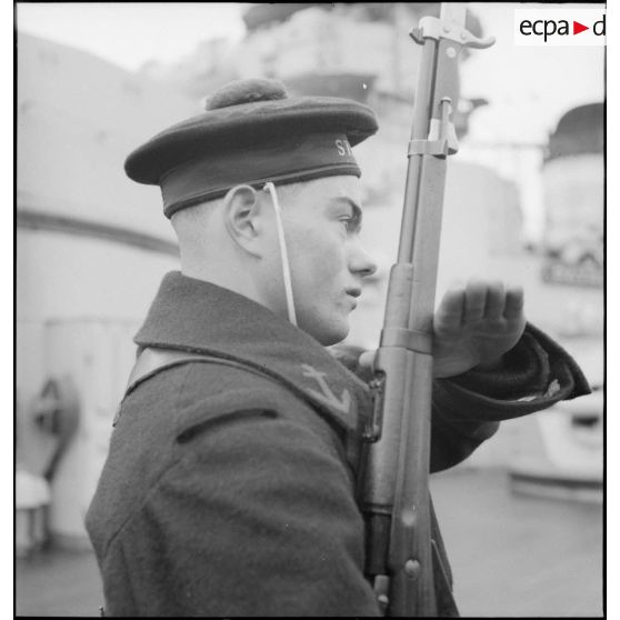 Portrait d'un marin présentant les armes à bord du cuirassé Strasbourg.