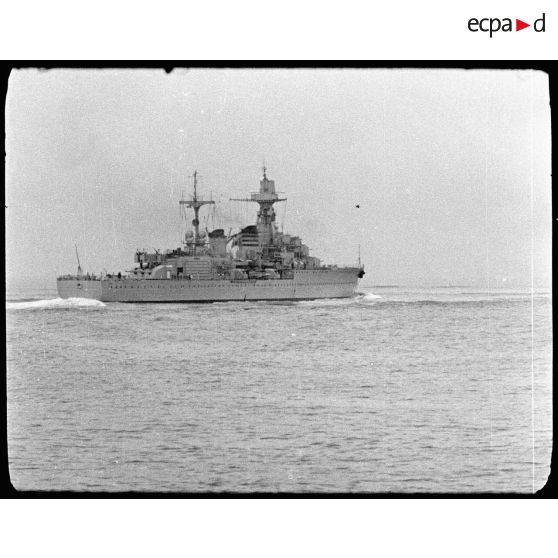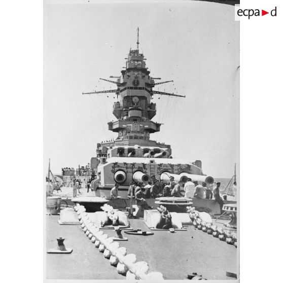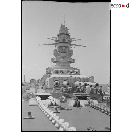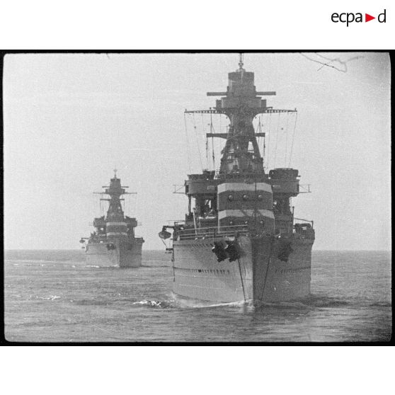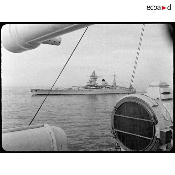 Vue bâbord du cuirassé Strasbourg depuis son sister ship le cuirassé Dunkerque.