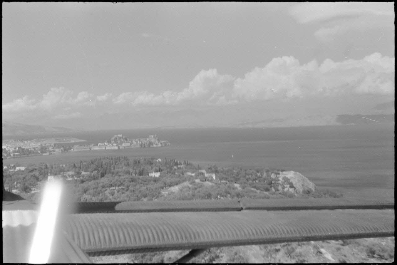 Vue aérienne de Corfou et des alentours prise à bord d'un avion de transport Junkers Ju-52.