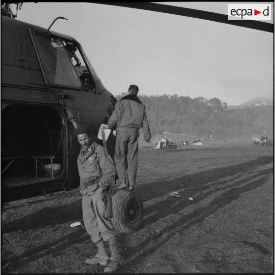 Embarquement d'un commando parachutiste à bord d'hélicoptères de transport dans le secteur de Tablat.