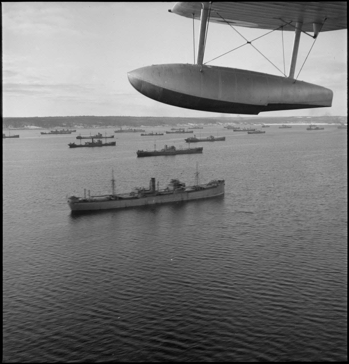 Vue aérienne depuis un hydravion sur un convoi qui longe une côte.