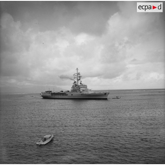 Arrivée du porte-hélicoptères Jeanne d'Arc (R97), au remorquage dans la rade de Papeete (Tahiti), 1964.