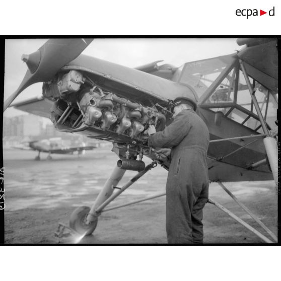 Au Ministère de l'Air, boulevard Victor, un mécanicien répare le moteur d'un avion de type un Fi 156 Storch, avec en arrière plan un Bf 108.