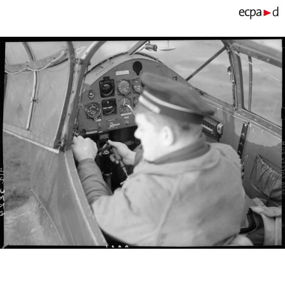 Un mécanicien vérifie l'appareil de bord d'un avion stationné dans une cour du Ministère de l'Air, boulevard Victor.
