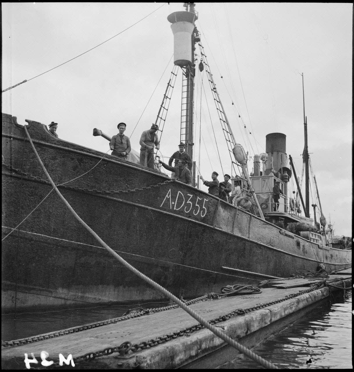 Vue bâbord du chalutier de la marine marchande Roche noire, numéro de coque AD 355, réquisitionné et armé par la Marine nationale en août 1939 pour servir comme dragueur de mines auxiliaire.